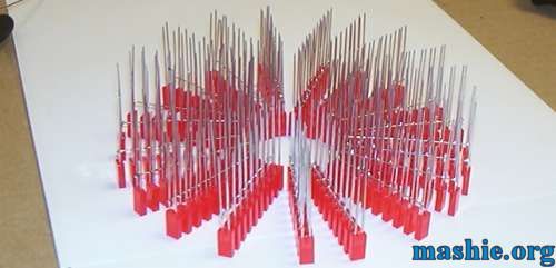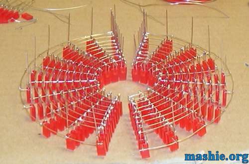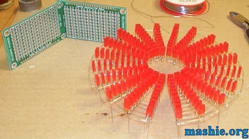 ![]() Now I had to figure out how to solder 200 LEDs in a circular pattern without a PCB. Easy, just solder them one by one to tinned copper. Bad idea, didn't work at all. I had to build a small jig so the LEDs would stay in place and also so the wire wouldn't roll away. After some trial and error including killing ten or so LEDs I had found a working procedure. They were soldered ten by ten in the first stage as you can see above.