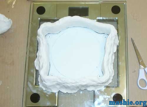 ![]() To keep the resin in place, a frame out of Plasticine clay was made.