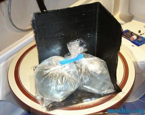 So to reach six layers another two layers were "glued on" to what will be the back, this time the bottom layer is residing against some mylar sheet to give a shiny finish. The plastic bags contains nothing but water to give a nice even force downwards.