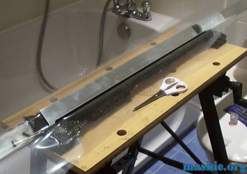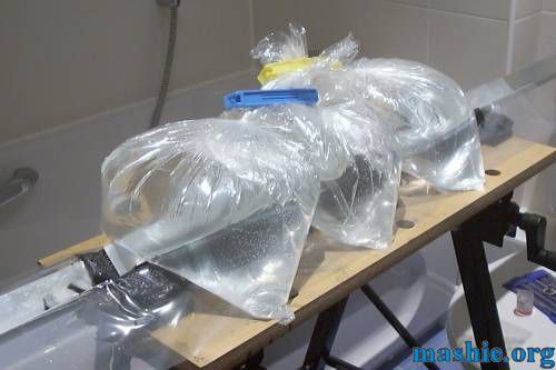 Some L-shaped pieces will also be needed so here we go with a nice sandwich of material. From the bottom: Aluminium profile, mylar sheet, carbon fibre + epoxy, mylar sheet, aluminium profile and a few more bags of water to add pressure.
