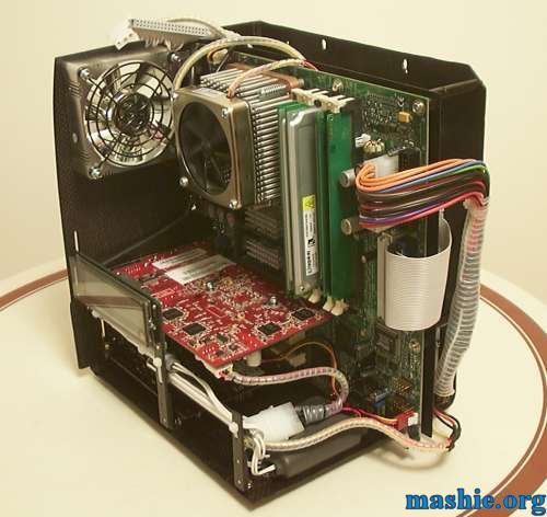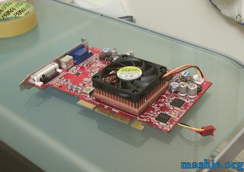 ![]() The ATI 9700 PRO arrived and was promptly modded. The original HSF was replaced with an Akasa AK 350 1U copper HSF. It was easy to mount after two holes were drilled and threaded with M3 threads. To make it mate nicely with the core, the material touching the shim was removed from the bottom of the heat sink with a Dremel.