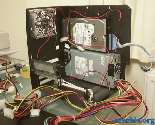 ![]() A dark blue filter (gel sheet) was mounted with double sided tape behind the hole to give the VFD a matching colour to the CCFLs. In this picture, the VFD is simply connected to another computer for testing.