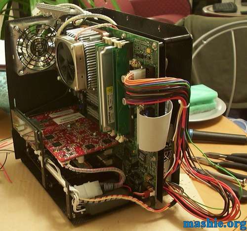 ![]() Got wires? The four 4" CCFLs have been installed, 2 on each side facing the air intakes on the O2 shell. You can see the inverters for the lights on the other side to the left of the HDD. The two lights next to the VFD were installed using some more brackets made out of Carbon Fibre.