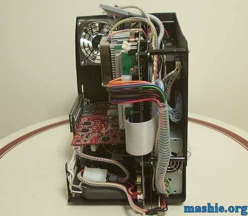 ![]() And the rear with the fan screws colored black, no further fan guard will be added. The thingy to the right of the ATI 9700 is the VFD. It had to be mounted halfway through the backplane to line up properly with the hole on the side. I did consider cutting the PCB for a while but this was a better choice in the end.