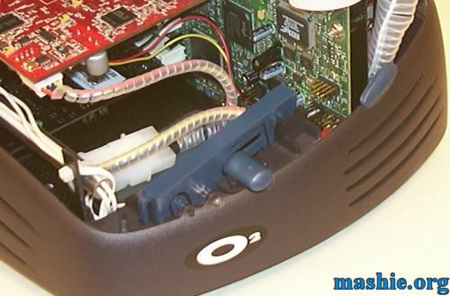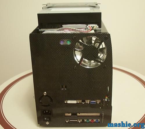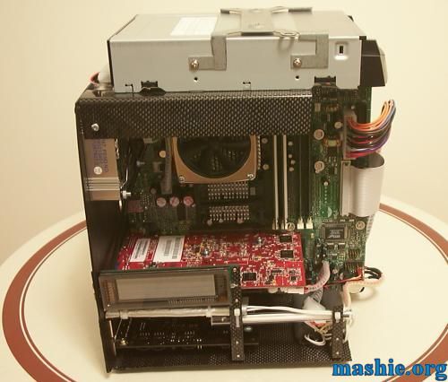 ![]() The few remaining pieces have been added. The old volume controls have been a bit smaller and glued in place to give enough clearance for the motherboard. A small micro switch is glued in place behind the power button. To the left of it is an acrylic rod used to redirect the light from the original green and yellow LED to the front, the blue CCFLs provide the light now.
