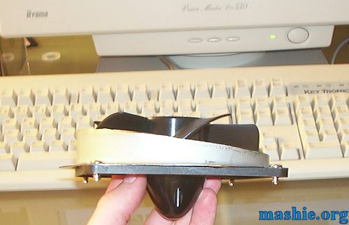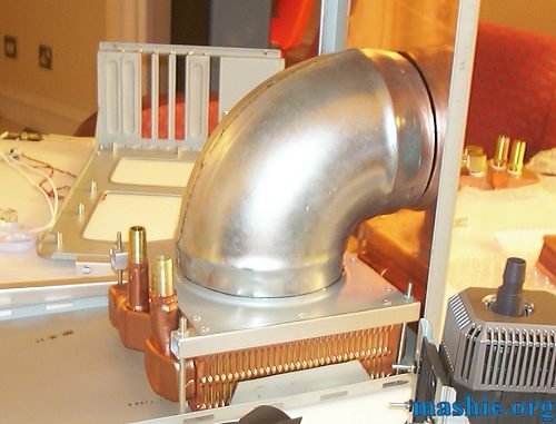 and held in place by four screws going through the bottom of the case. On top of that is one of the main features of this mod, a 5" ventilation duct bend.