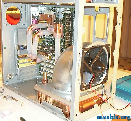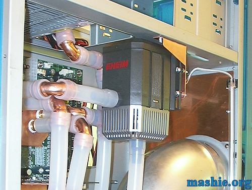 ![]() To keep the waterloop compact the pump was mounted hanging at the top in a custom made copper bracket. To initially fill the system with water was an