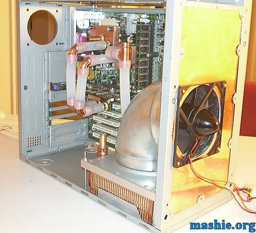 the side to permit filling outside the case. To the right of the pump is a small 12V relay controlling the 220V pump so it only runs when the computer is on.