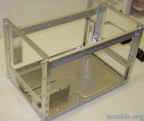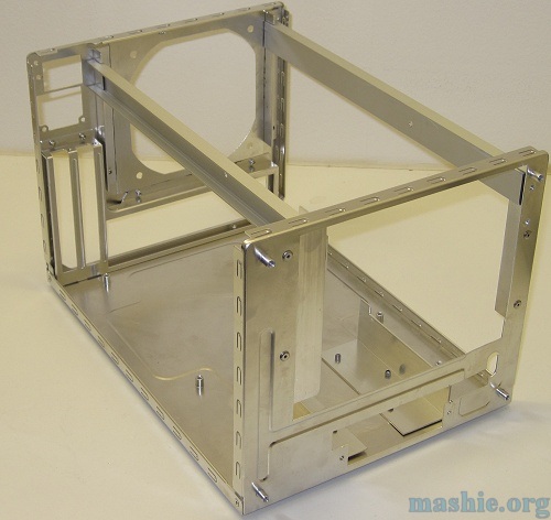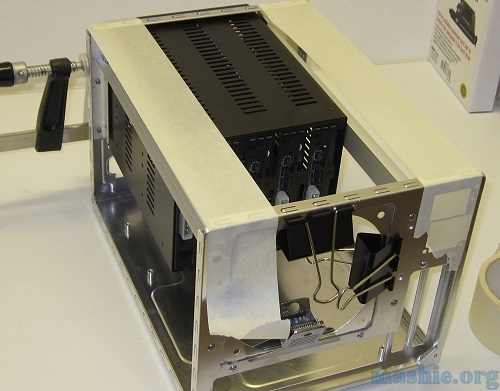 ![]() The U-profiles however are not riveted but glued to the L-profiles using JB Weld. Also the fan mount is attached with JB Weld. The 5-in-3 bay is there to make everything square.