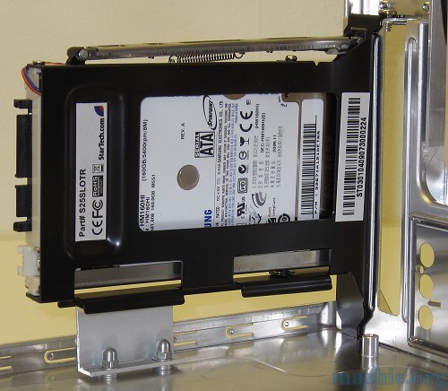 ![]() The other hot-swap bay has been mounted in the spare expansion slot. As the mini-itx board doesn't have a second PCI slot a small U-profile was added to provide the equivalent support.