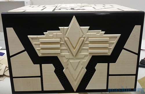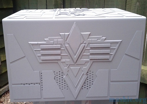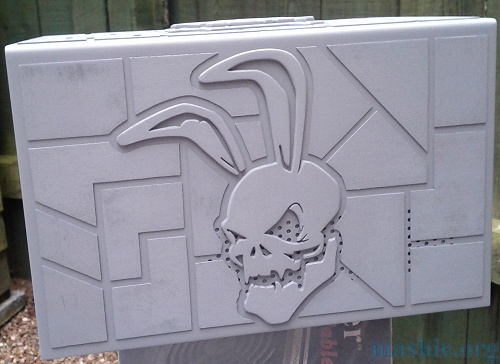 ![]() ![]() Step four, five, six... Add wear and dents, chamfer all edges, glue together, add more chamfers, add letters, sand smooth, attach to case and add some more armor plates. Sorry I totally forgot to take pictures of each step.