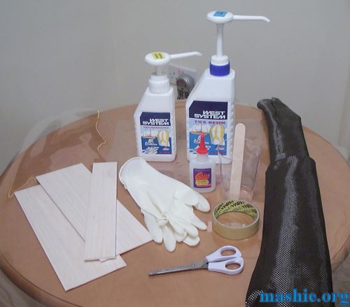 West System, the resin is number 105 and the hardener is 205. From the left we have 3mm (1/8") balsa wood panels,