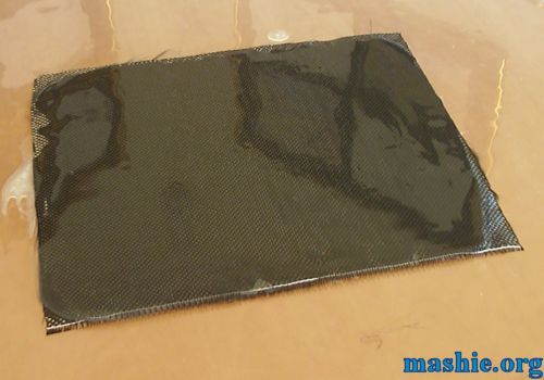 ![]() ![]() The final layer of carbon fibre added. If the amount of epoxy underneath isn't enough to get the fabric wet you can add