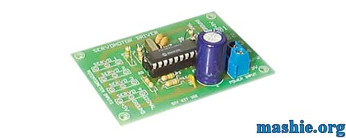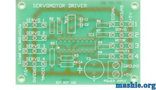 Servo motors are used in radio-controlled models (cars, planes), robotics, theme park special effects, test equipment, industrial automation. At the hobbyist end of the market they are small, compact and relatively inexpensive at around $US20. The motors themselves are black boxes which contain a motor, gearbox and decoder electronics. Three wires go into the box; 5V, ground and signal. A short shaft comes out of the motor which usually has a circular interface plate attached to it. Most servos will rotate through about 100 degrees in less than a second according to signal input. This kit will control up to 4 servo motors simultaneously. All the work controlling the servos is done in the preprogrammed PIC micro-controller (uC). As such the kit provides a textbook example of how a uC can replace a handful of IC's and other glue chips. The input signals are between 0 - 5V delivered by connecting up the potentiometers as voltage dividers. Inside the PIC and AD converter (multiplexed when there is more than one input signal) changes the voltage signal into the Pulse Code Modulation system used by servo motors. This signal is a 5V pulse between 1 and 2 msec long repeated 50 times per second. That is, a 20msec frame rate. The width of the pulse determines the position of the server. Most servos will move to the center of their travel when they receive a 1.5msec pulse. One extreme of motion generally equates to a pulse width of 1.0msec; the other extreme to 2.0msec with a smooth variation throughout the range, and neutral at 1.5msec. The period between the pulses is used to synchronize the receiver. Servos are closed loop devices. They are constantly comparing their position (proportional to the pulse width) to their actual position (proportional to the signal voltage input). If there is a difference between the two, the servos electronics will turn the motor to adjust the difference error. This also means that servos will resist forces which try to change their position. When a servo is unpowered or not receiving positioning pulses the output shaft can be easily turned by hand. So in short you use one potentiometer for each servo, when you turn the potentiometer the servo will move the same distance. ![]() As you can see the layout is really simple, in the middle goes the PIC processor and a few other